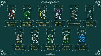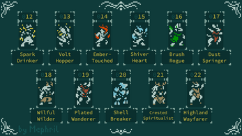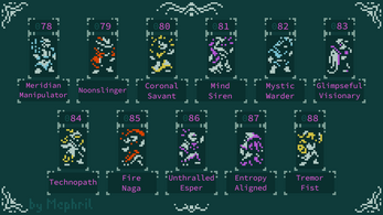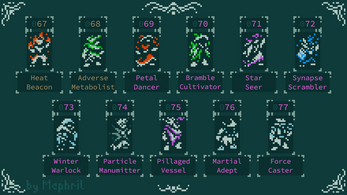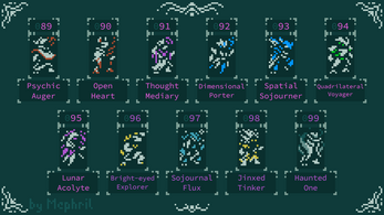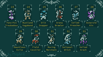Once this mod is installed, these tiles can be found in the "customize" portion of character creation (where you write your character's name) in the CYF tile selection menu under "Expansions"; or by changing your tile in-game by visiting a gutsmonger, downloading and using Kernelmethod's Magic Mirror mod, or by wishing for "chooseyourfighter:change". (The wish menu keybinds are unbound by default.)